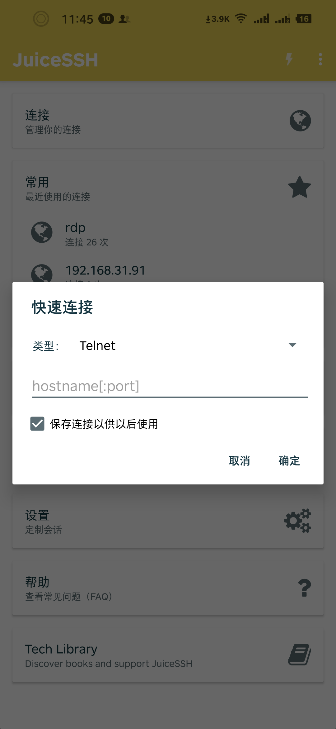 有时候我们在外没有电脑,也可以通过手机软件来达到远程目的,比如下面这款软件。(私信回复「104」获取)。 在新建的连接中,只需要选择telnet即可,也可以支持ssh协议切换。