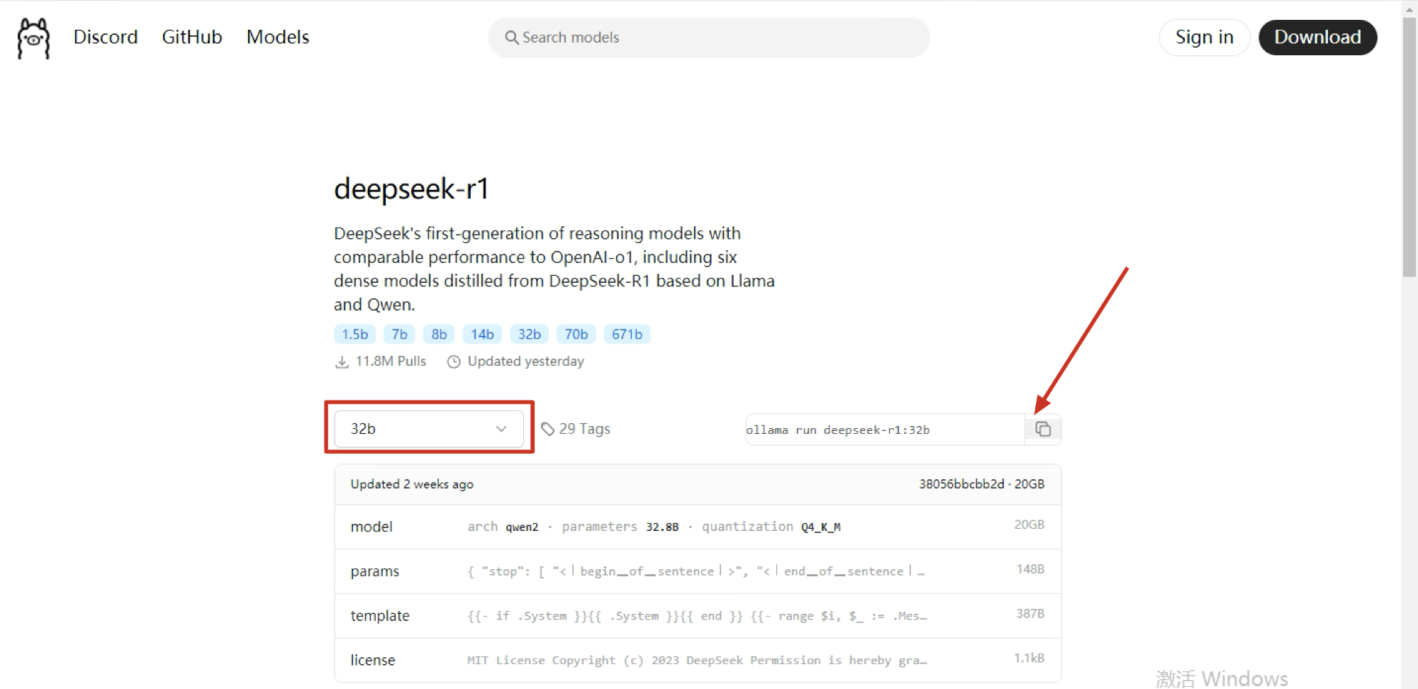 专用显存为24GB,所以根据配置对照表,我这里选择DeepSeek的32b版本模型。