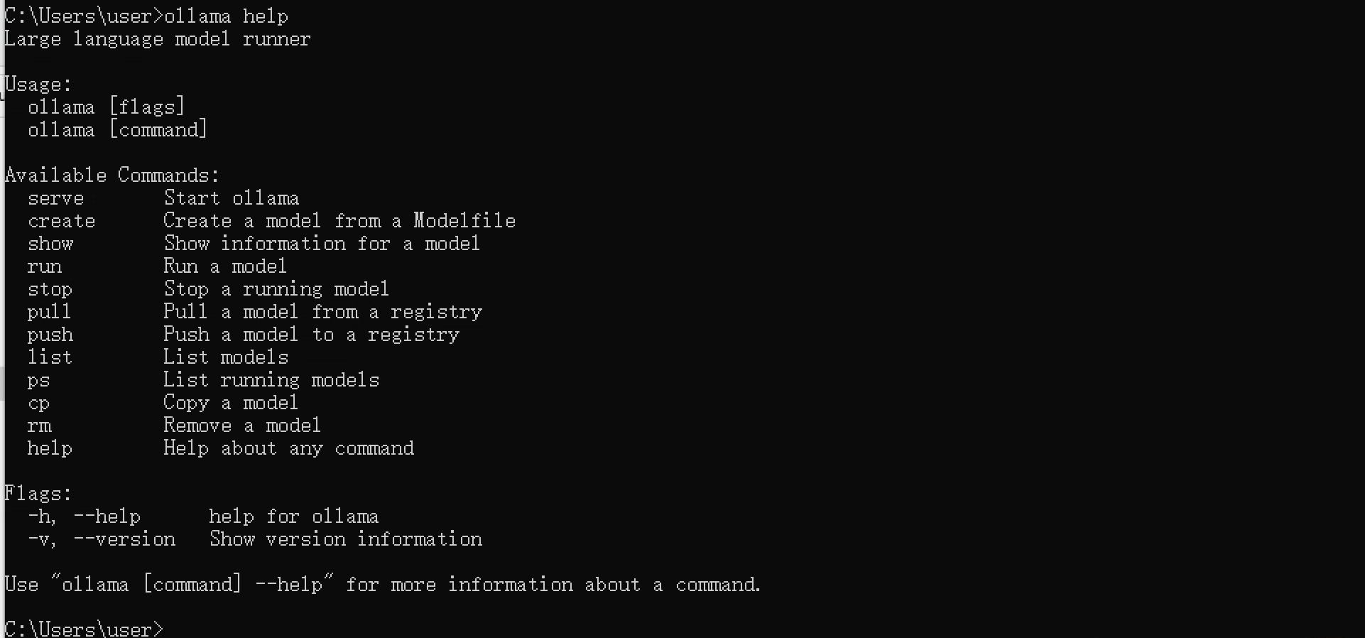 当我们重启电脑或Ollama应用后,应当如何再次启动我们的模型呢?使用Ollama help可以看到所有的命令提示: